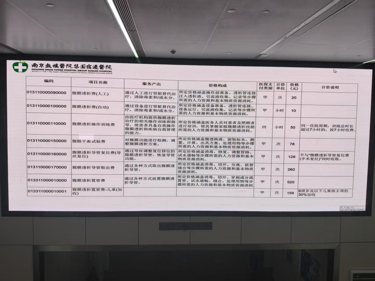 013110000090000 | 腹膜透析費(fèi)(人工) | 通過人工進(jìn)行腎臟替代治療,清除毒素和/或水分。 | 所定價(jià)格涵蓋操作前準(zhǔn)備、透析管連接、注入透析液、引流液收集、記錄等步驟所需的人力資源和基本物質(zhì)資源消耗。 | 甲 | 次 | 20 | |