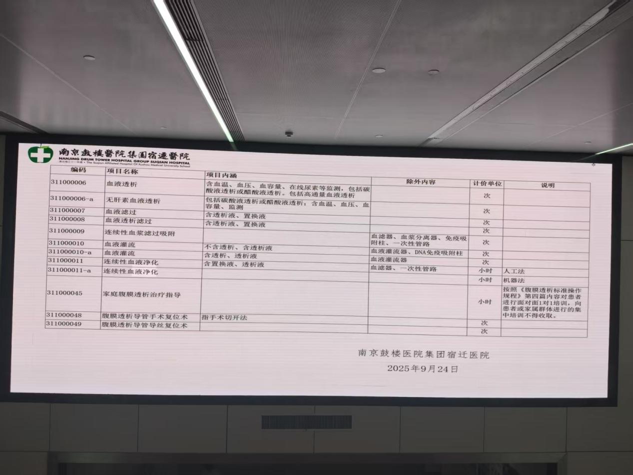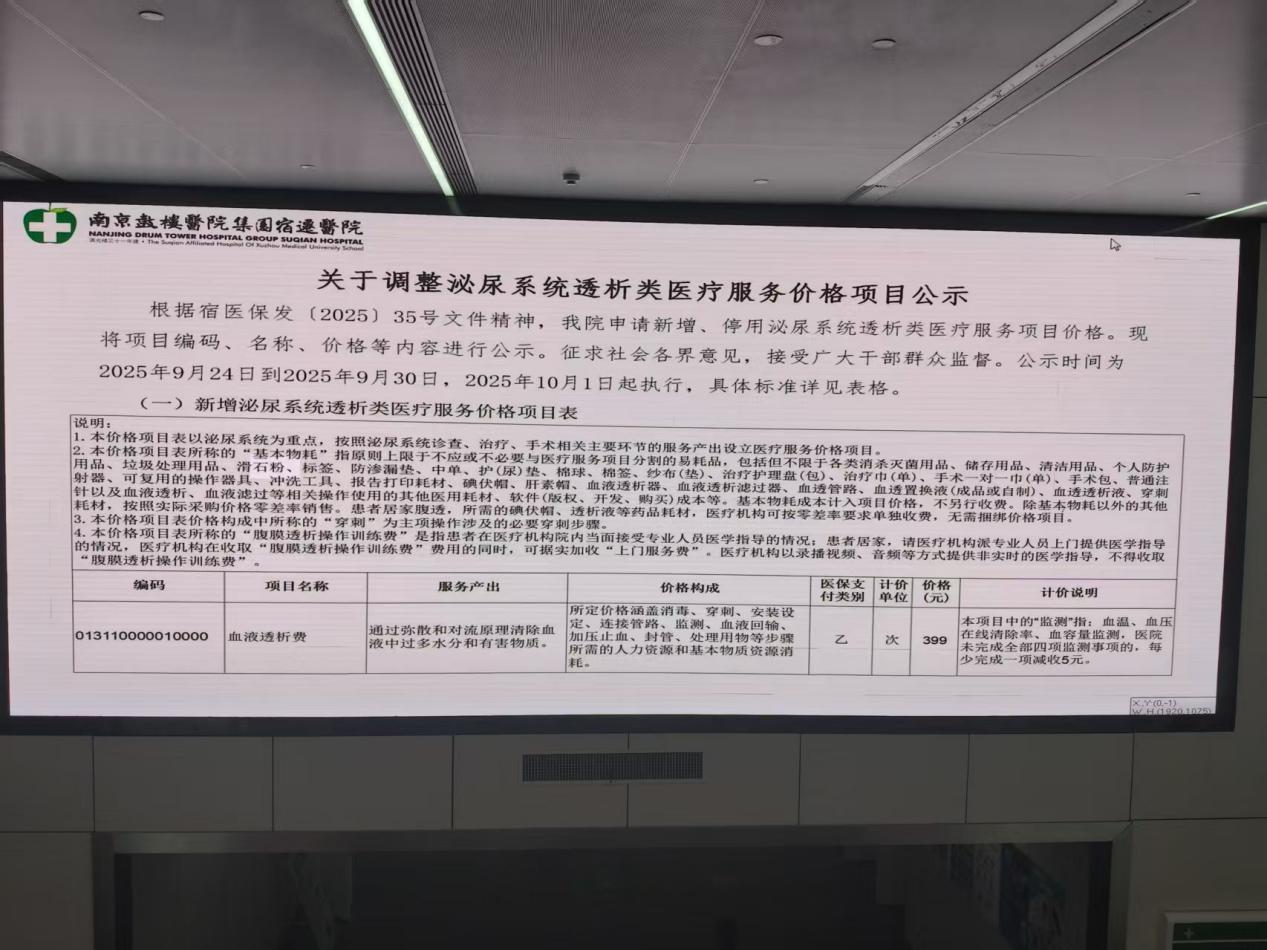根據(jù)宿醫(yī)保發(fā)〔2025〕35號(hào)文件精神,我院申請(qǐng)新增、停用泌尿系統(tǒng)透析類醫(yī)療服務(wù)項(xiàng)目?jī)r(jià)格?,F(xiàn)將項(xiàng)目編碼、名稱、價(jià)格等內(nèi)容進(jìn)行公示。征求社會(huì)各界意見,接受廣大干部群眾監(jiān)督。公示時(shí)間為2025年9月24日到2025年9月30日,2025年10月1日起執(zhí)行,具體標(biāo)準(zhǔn)詳見表格。